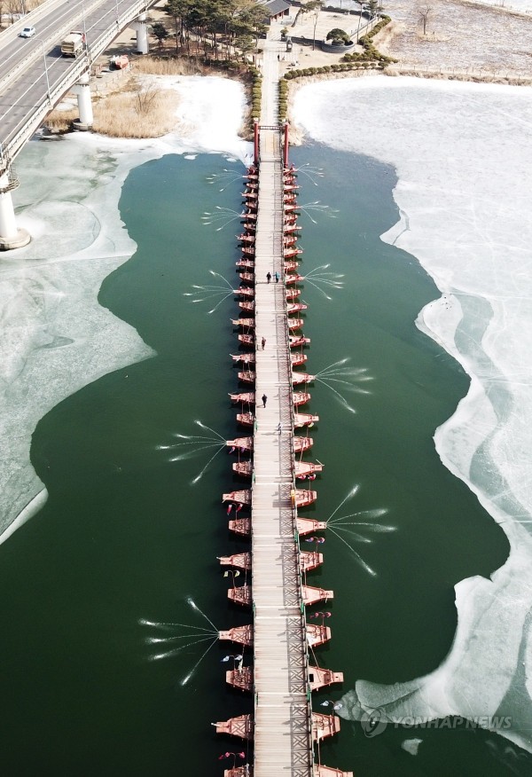우수가 지나며 봄에 점점 가까워지고 있는 21일 오전 경기도 양평군 두물머리에 설치된 배다리 주변에 언 강물이 녹고 있다.