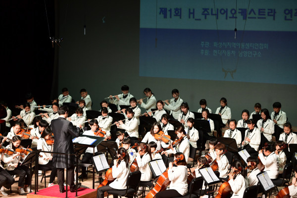 경기 화성시지역아동센터 12곳 72명의 아동으로 구성된 ‘H-주니어 오케스트라’가 20일 모두누림센터 누림아트홀에서 연주회를 개최했다. 사진은 오케스트라 단원들이 공연을 진행하는 모습. (사진제공=화성시청)