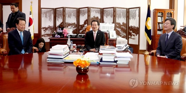 정세균 국회의장(가운데)이 21일 국회의장실을 방문한 바른미래당 박주선(왼쪽)·유승민 공동대표와 대화하고 있다.