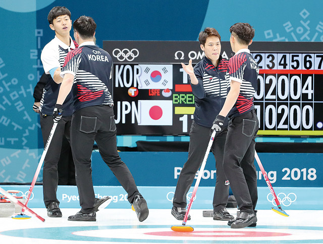 21일 강원도 강릉 컬링센터에서 열린 2018평창동계올림픽 남자컬링 예선 9차전 한국과 일본의 경기에서 한국대표팀이 대량득점 후 환호하고 있다.