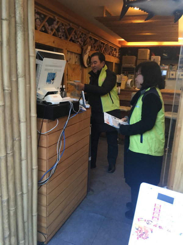 경기 수원시 팔달구 인계동 지역사회보장협의체는 21일 협의체 위원 15명이 참여한 가운데 복지사각지대 해소를 위한 홍보 캠페인을 실시했다. 사진은 참여자들이 가게에 들어가 홍보물품을 배부하는 모습. (사진제공=팔달구청)