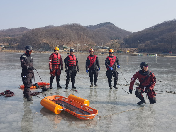 경기 동두천소방서 119구조대가 지난 20~21일 양일간 양주시 남면 소재의 봉암저수지에서 수난구조를 위한 현지 적응훈련에 돌입했다. 사진은 구조대원들이 수난구조 들것과 로프를 이용한 2인 구조법 훈련을 하는 모습. (사진제공=동두천소방서)