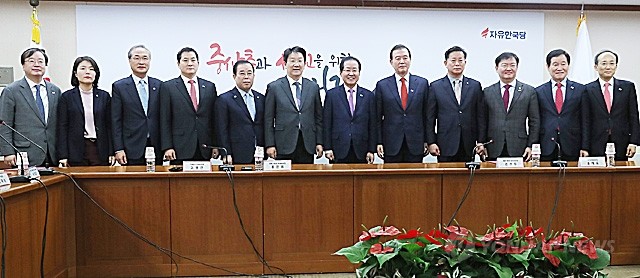 자유한국당 홍준표 대표가 22일 오전 서울 여의도 당사에서 열린 지방선거 총괄기획단 임명장 수여식에서 홍문표·권성동 공동위원장 및 위원들과 기념촬영을 하고 있다.