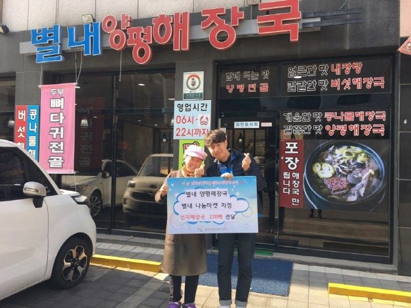 경기 남양주시 별내 양평해장국이 최근 별내나눔마켓에 선지 해장국을 기탁했다. 별내 양평해장국은 해장국 220개(220인분)를 11개월에 걸쳐 별내희망케어센터에 전달할 예정이다. 사진은 해장국 기탁을 기념해 관계자가 기념촬영을 하는 모습.(사진제공=남양주시청)