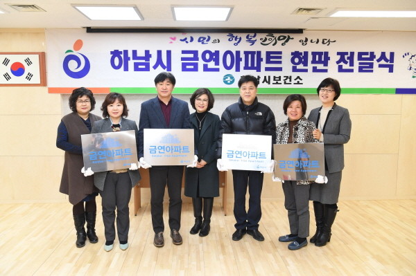 경기 하남시는 최근 시청 상황실에서 금연아파트로 추가 지정된 5개 공동주택에 '금연아파트' 현판을 전달했다. 사진은 금연아파트 현판을 전달받은 아파트 관계자들이 기념촬영을 하는 모습.(사진제공=하남시청)