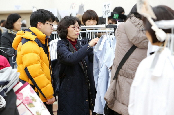 23일 오전 서울 양천구청 양천홀에서 교복 자켓은 7000원 내외, 셔츠는 3000원 이하의 저렴한 가격으로 판매하고, 판매 수익금은 지역내 중·고등학생들의 장학금으로 전달하는 '교복 및 학생용품 교환 장터'를 운영했다. 사진은 장터에서 교복을 고르고 있는 학부모와 자녀들의 모습.(사진제공=양천구청)