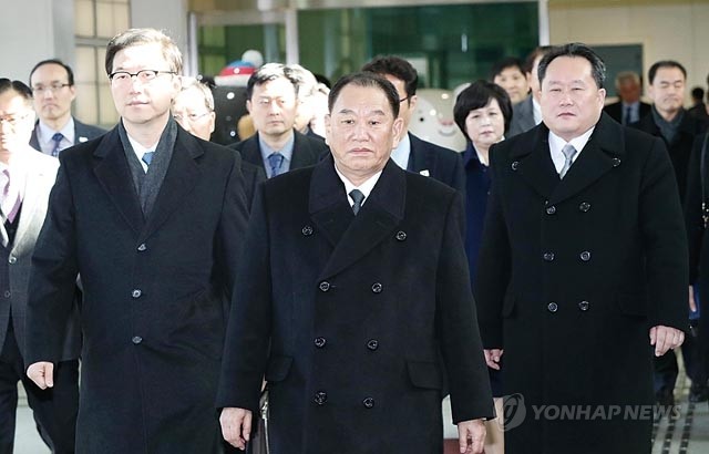 평창동계올림픽 폐회식 참석차 남측을 방문한 김영철 북한 노동당 중앙위원회 부위원장(가운데)과 리선권 조국평화통일위원회 위원장(오른쪽) 등 북한 고위급대표단이 25일 오전 파주 남북출입사무소(CIQ)에 도착해 천해성 통일부 차관(왼쪽)의 안내를 받으며 이동하고 있다.