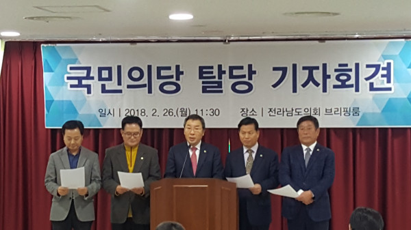 [무안=황승순 기자] 임명규 전남도의회 의장을 비롯한 도의원 6명은 26일 기자회견을 열고 "바른미래당으로의 정당합당은 도민의 의견을 무시하고 지방자치를 역행한 것"이라고 비판하며 국민의당을 탈당하겠다고 밝혔다. 이번에 국민의당을 탈당한 도의원은 임 의장과 조상래·박현호·이충식·민병홍·주연창 의원 등 6명이다.