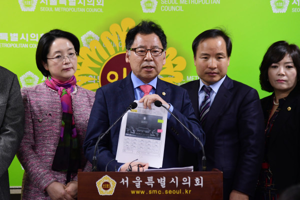 | ▲ 서울시의회 자유한국당 의원들이 기자회견에 참석해 발언을 이어가고 있다. (사진제공=서울시의회) | ||