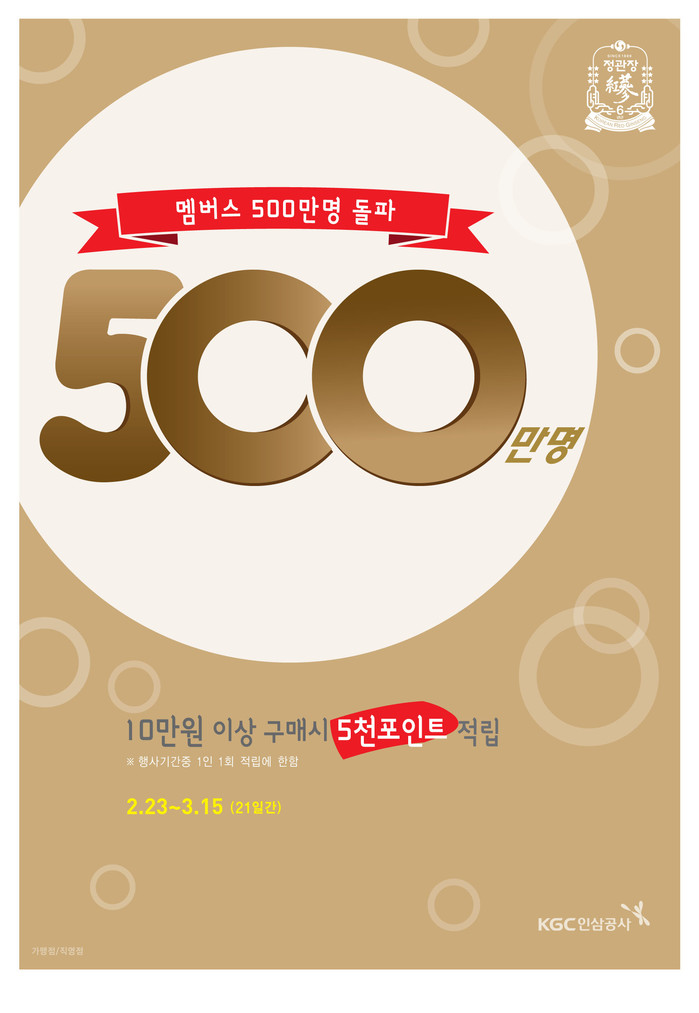 KGC인삼공사는 ‘정관장 멤버스’ 500만 돌파를 기념하여 전국 정관장 매장에서 10만원 이상 제품 구매 시 5,000포인트 추가 적립 혜택(1인 1회 한정)을 3월 15일까지 제공한다.