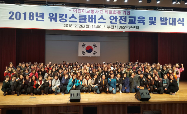 경기 부천시는 26일 어린이통학안전사업 워킹스쿨버스 발대식을 가졌다. 워킹스쿨버스는 훈련된 안전교육지도사가 어린이들과 함께 하는 등·하교 사업이며, 지도사들은 오는 3월2일부터 활동을 시작한다. 사진은 160명의 안전지도사들과 관계자들이 기념촬영을 하는 모습. (사진제공=부천시청)