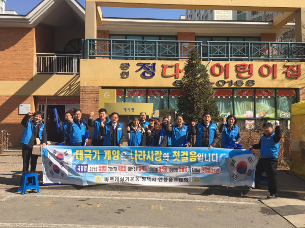 26일 경기 평택시 안중읍 바르게살기위원회 임원, 바르게살기운동 평택시협의회, 안중읍행정복지센터 직원 등 20여명이 안중읍 주공1단지 앞에서 3.1절을 맞아 주민들을 대상으로 태극기 나눠주기 행사를 실시, 총 300개의 태극기를 배포했다. 사진은 기념촬영을 하고 있는 봉사자들의 모습. (사진제공=평택시청)