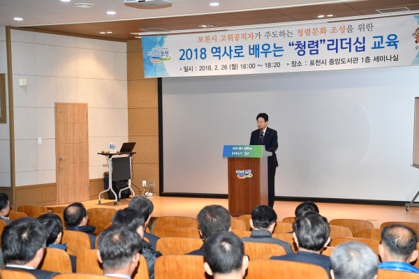 경기 포천시는 26일 포천시립중앙도서관에서 고위공직자가 주도하는 청렴문화를 조성하자는 취지로 간부공무원 120여명이 참석한 가운데 ‘고위직 청렴 리더십 교육’을 실시했다. 사진은 참석한 관계자들이 교육을 받고 있는 모습. (사진제공=포천시청)