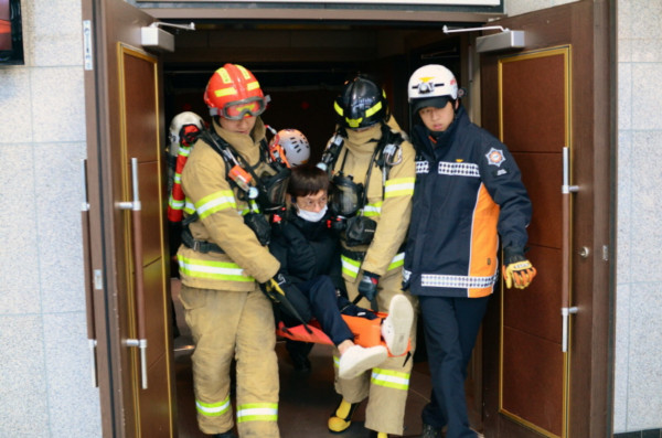 경기 연천군시설관리공단은 27일 연천소방서와 함께 연천수레울아트홀에서 ‘종합소방훈련’을 실시했다. 사진은 훈련에 참가한 소방관들이 사고 상황을 가정, 환자 도수 이동 훈련을 하고 있는 모습. (사진제공=연천군청)