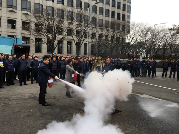서울 영등포소방서는 27일 한국전력 남서울본부와 공공기관 합동 소방훈련을 실시했다. 사진은 참여자들이 소화기 사용 실습을 하고 있는 모습. (사진제공=영등포소방서)