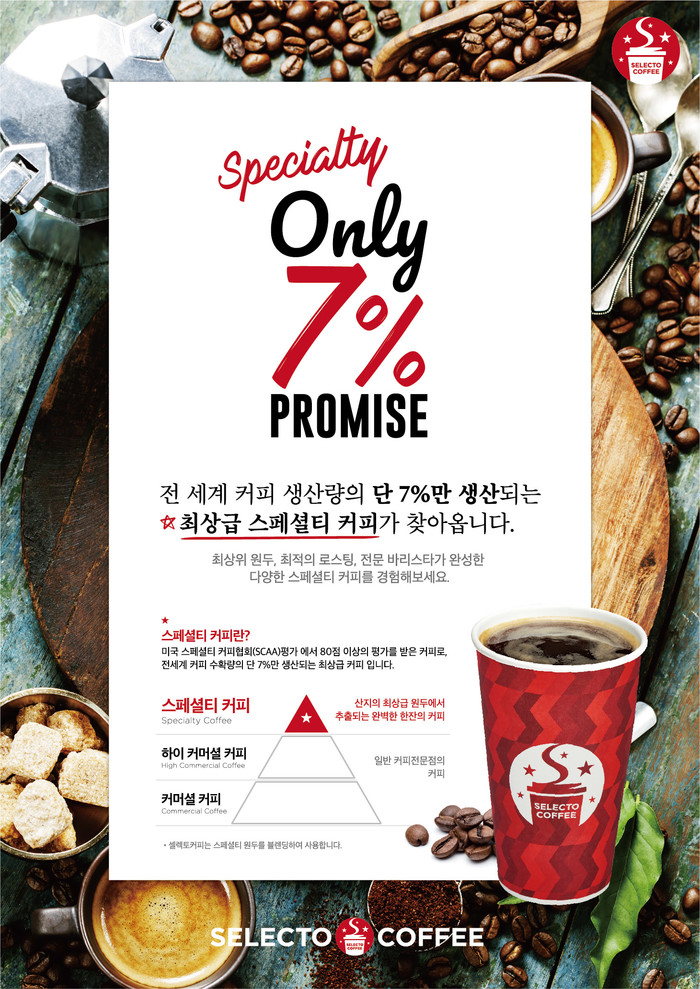 이렇게 까다로운 조건으로 전 세계에서 생산되는 커피의 단 7%만이 스페셜티라는 타이틀을 얻을 수 있다. 아메리카노 셀렉트샵이라는 차별화된 브랜드 콘셉트의 셀렉토커피에서는 국내 최초 ‘스페셜티 아메리카노 전문 샵’으로 발돋움하며, 브랜드 아이덴티티를 스페셜티 커피와 함께 차별화할 전망이다.
