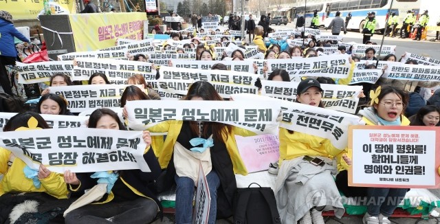 1일 오후 서울 종로구 일본대사관 앞에서 열린 3.1절 99주년 청년학생 친일청산 행동의 날 행사에서 참가자들이 문제 해결을 촉구하는 구호를 외치고 있다.