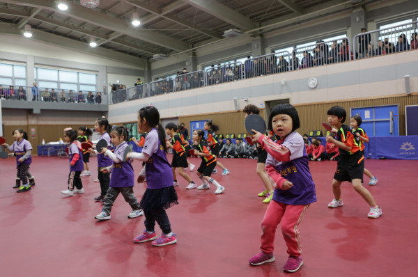 금천구는 최근 초·중·고 탁구부의 체계적인 육성과 주민 생활체육공간 제공을 위해 건립한 ‘독산고 탁구전용관’ 개관식을 개최했다. 사진은 개관식을 기념해 ‘금빛나래 유아탁구단’이 축하공연으로 탁구댄스를 선보이는 모습. (사진제공=금천구청)