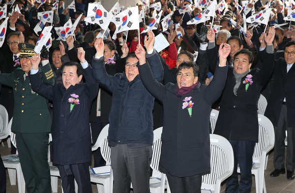 충남 천안시 소재 독립기념관에서 지난 1일 독립유공자와 광복회원 등 보훈 관련 단체 관계자, 충남도 관계자 등이 참석한 가운데 ‘제99주년 3.1절 기념식’이 개최했다. 사진은 기념식에서 관계자들이 태극기를 들고 ‘만세 삼창’을 외치고 있는 모습.(사진제공=충남도청)