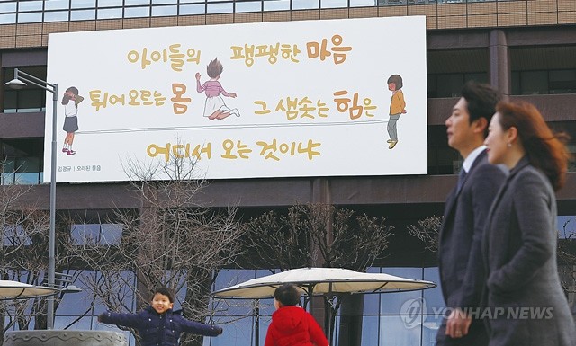 5일 서울 광화문 교보생명 빌딩에 새로 내걸린 광화문글판 밑으로 시민들이 지나가고 있다. 새 글판 ‘봄편’은 김광규 시인의 ‘오래된 물음’에서 가져왔다.