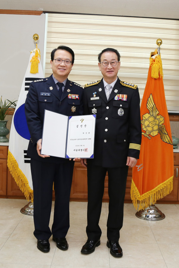 영등포소방서는 남성의용소방대장 허상호씨가 6일 연임됐다. 사진은 이귀홍 소방서장과 허 대장이 기념촬영을 하고 있는 모습. (사진제공=영등포소방서)