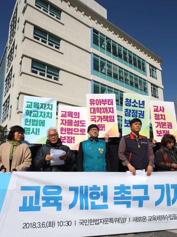 6일 오전 서울 종로구 창성동 정부청사별관 앞에서 열린 교육 개헌 촉구 기자회견에서 새로운교육체제수립을 위한 사회적교육위원회 소속 대표자들이 교육 평등 헌법 보장을 요구하는 성명서를 낭독하고 있다.