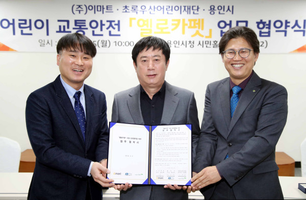 경기 용인시는 지난 5일 시청 시민사랑방에서 (주)이마트, 초록우산어린이재단과 어린이 교통안전을 위한 ‘옐로카펫 업무협약’을 체결했다. 사진은 시청과 이마트·어린이재단 관계자들이 협약을 체결한 후 기념촬영을 하는 모습. (사진제공=용인시청)