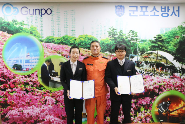 경기 군포소방서는 지난 2일 2017년도 하반기 으뜸소방관으로 양종은 소방장과 범정아 소방장을 선정했다. 사진은 표창장 수여식 후 소방서장 및 관계자들이 기념촬영을 하는 모습. (사진제공=군포소방서)