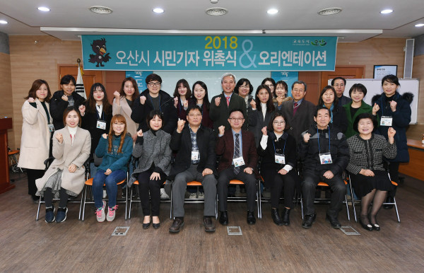 최근 경기 오산시는 시청 물향기실에서 ‘제4기 오산시 시민기자단 위촉식’을 개최하고, 신규 시민기자 18명을 위촉한 후 오리엔테이션을 통해 시민기자 활동내용을 안내했다. 사진은 위촉된 신규 시민기자와 시 관계자 등이 기념촬영을 하는 모습. (사진제공=오산시청)
