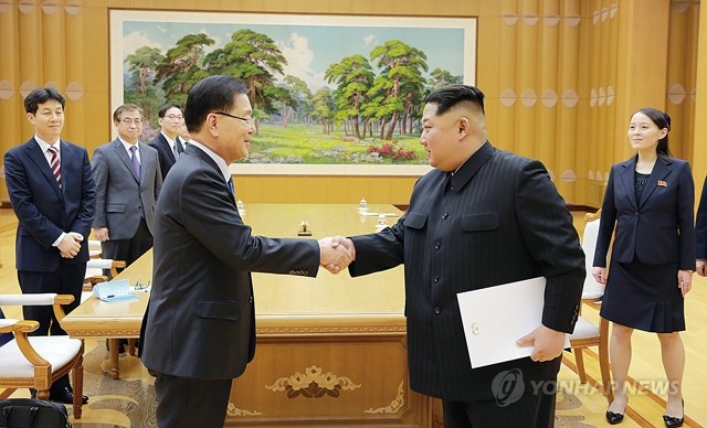 북한을 방문한 정의용 수석 대북특사가 지난 5일 방북 후 평양에서 김정은 북한 노동당 위원장과 만나고 있다. 김 위원장이 문재인 대통령의 친서를 들고 있다. 오른쪽은 김여정 노동당 중앙위 제1부부장.