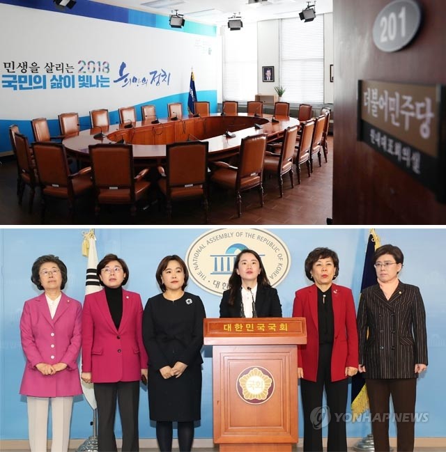 안희정 지사의 성폭력 사태와 관련해 파문이 커지는 가운데 6일 오전 국회 본청 더불어민주당 원내대표 회의실의 불이 꺼져 있다. 앞서 원내대표 회의실에서는 원내대책회의가 열릴 예정이었으나 회의가 갑작스레 취소됐다(위). 자유한국당 신보라 원내대변인이 6일 서울 국회 정론관에서 안희정 전 충남지사의 성폭행 의혹 사태와 관련해 기자회견하고 있다.