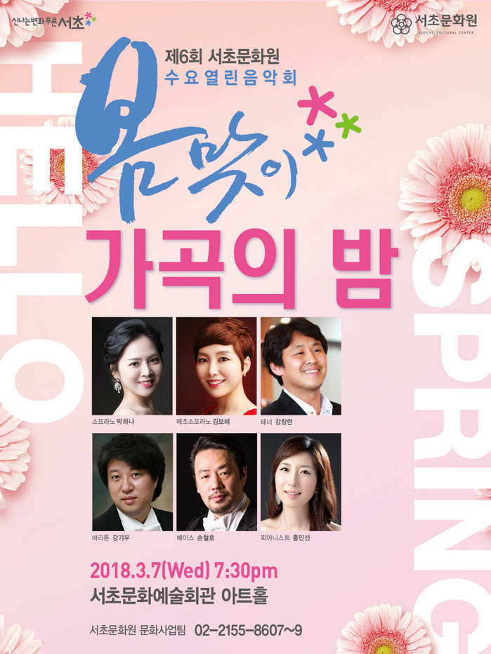 이날 공연은 서초구와 서초문화원이 공동 주최하는 것으로, 음악평론가 유형종의 사회로 소프라노 박하나와 메조소프라노 김보혜, 테너 강창련, 바리톤 강기우, 베이스 손철호가 함께하며, 홍민선 피아니스트가 반주한다.