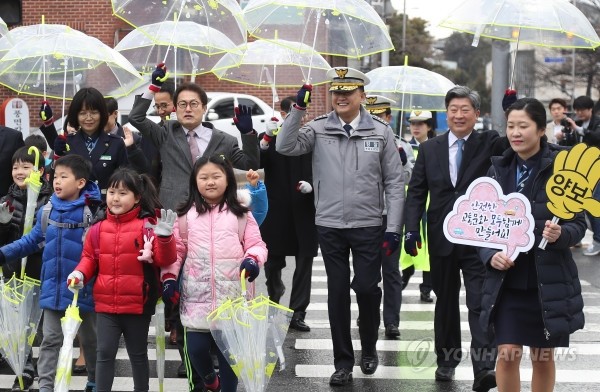8일 오전 서울 종로구 청운초등학교에서 열린 도로교통공단 스쿨존 교통사고 ZERO 캠페인에서 윤종기 도로교통공단 이사장(오른쪽 두번째부터), 조희연 서울시 교육감, 이철성 경찰청장이 학생들과 함께 횡단보도 안전하게 건너기 체험을 하고 있다.