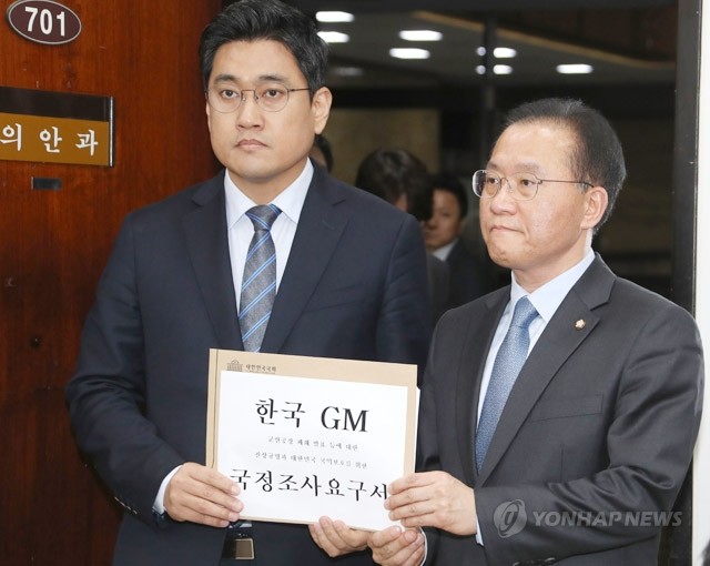 자유한국당 윤재옥(오른쪽)·바른미래당 오신환 원내수석부대표가 8일 국회 의안과에 `한국GM 국정조사요구서'를 제출하고 있다.