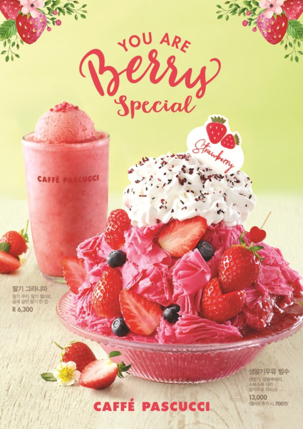 기존 파스쿠찌 딸기음료는 ‘딸기치즈큐브쉐이크’, ‘딸기블로썸쉐이크’, ‘딸기스파클링’, ‘딸기라떼’, ‘딸기요거트’, ‘딸기주스’ 등 총 6종이다. 치즈큐브, 생크림, 요거트, 젤라또 등의 각종 토핑을 더했으며, 주스 타입, 쉐이크 타입, 에이드 타입으로 다양하게 구성해 취향에 따라 맛볼 수 있는 것이 특징이다.