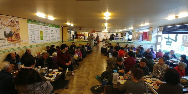 경기 남양주시 명덕사가 홀몸노인 및 노인회장 등 노인 130여명을 초청해 점심식사를 대접하고 홀몸노인 50명에게는 식사대접 후 소고기를 전달했다. 사진은 명덕사에서 식사를 대접받고 있는 노인들의 모습.(사진제공=남양주시청)