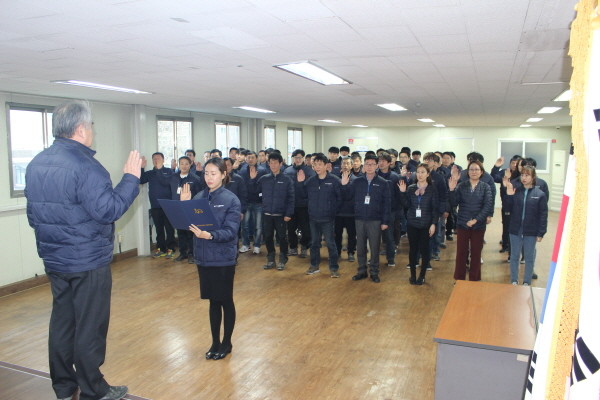 인천 남구시설관리공단은 8일 공단 회의실에서 사회공헌헌장 선포식을 했다. 선포식은 구시설관리공단이 주민에게 봉사하고 주민의 행복을 최고의 가치로 삼아 사회적 책임을 다하자는 내용을 담고 있다. 사진은 관리공단 직원들이 선서를 하는 모습.(사진제공=남구청)