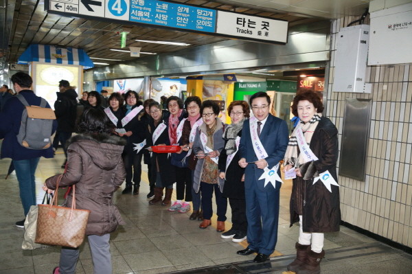 서울 도봉구가 8일 쌍문역에서 여성단체연합회 회원들과 함께 ‘세계 여성의 날 110주년’을 기념해 성폭력·성매매 예방 리플릿을 나눠주며 홍보하는 ‘세계여성의 날 기념 캠페인’을 실시했다. 사진은 캠페인에 참석한 관계자들이 홍보활동을 전개하고 있는 모습.(사진제공=도봉구청)