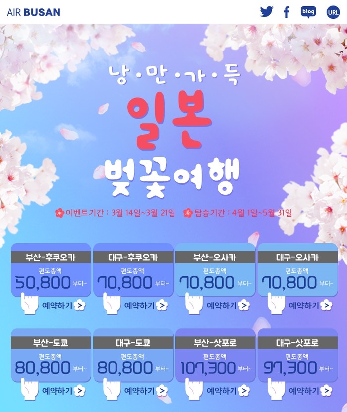 에어부산은 ‘낭만가득 일본 벚꽃여행’ 특가 항공권 이벤트를 오는 14일(수) 오전 11시부터 21일(수)까지 에어부산 홈페이지와 모바일 웹/앱에서 실시한다. 이번 이벤트는 부산과 대구에서 출발하는 전 일본 노선 대상으로, 탑승 기간은 오는 4월 1일부터 5월 31일까지다.
