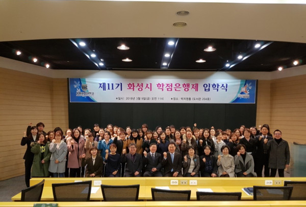 경기 화성시가 최근 수원과학대학교에서 ‘제11기 학점은행제 신입생 입학식’을 개최했다. 이날 입학식에는 박철수 수원과학대 총장, 양혜란 여성가족과장, 신입생과 재학생 등 100여명이 참석해 입학생들의 입학을 축하했다. 사진은 관계자들이 기념촬영을 하는 모습. (사진제공=화성시청)