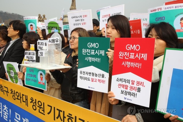 12일 오전 서울 종로구 청와대 분수대 앞에서 열린 GMO 완전표시제 국민청원운동 개시 기자회견에서 참가자들이 GMO 표시제도 강화를 촉구하는 손팻말을 들고 있다. 시민단체와 농업단체 등 57개 단체는 이날부터 GMO 완전표시제 도입을 위한 청와대에 국민청원 캠페인을 진행한다.