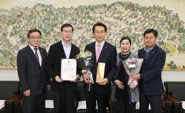 종로구가 최근 열린 ‘제14회 대한민국 지방자치 경영대전’, '지역개발 및 공공디자인 개선 부문'에서 우수상인 국토부장관상을 수상했다. 이번 대전에서 구는 청진구역 지하 공공보도 조성과 종로 도시비우기 사업에서 호평을 받았다. 사진은 수상 후 기념촬영을 하고 있는 구청장과 관계자들의 모습. (사진제공=종로구청)