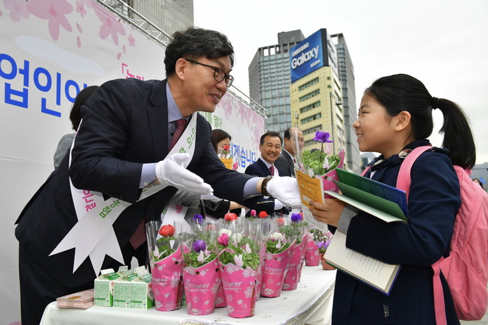| ▲ 이대훈 NH농협은행장이 14일 광화문역에서 진행된 ‘새봄맞이 고객사랑 가두캠페인’에 참석해 등교길 어린이에게 화분을 주고 있다.(사진제공=NH농협은행) | ||