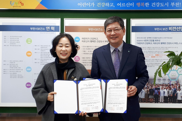 경기 부천시보건소는 13일 청소년성문화센터와 함께 아동·청소년의 성에 대한 올바른 가치관 형성과 건강한 성문화 정착을 위한 업무협약을 체결했다. 사진은 협약식에서 관계자가 기념촬영을 하는 모습. (사진제공=부천시청)