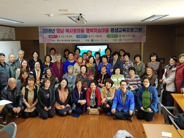 경기 화성시가 사할린 영주 귀국 동포들을 위해 마련한 ‘복사꽃 행복학습마을’이 13일 개강했다. 이번 학기에는 사할린 동포 32명과 마을 주민 23명, 총 55명이 입학했다. 사진은 개강을 기념해 사할린 동포와 마을주민이 기념촬영을 하는 모습. (사진제공=화성시청)