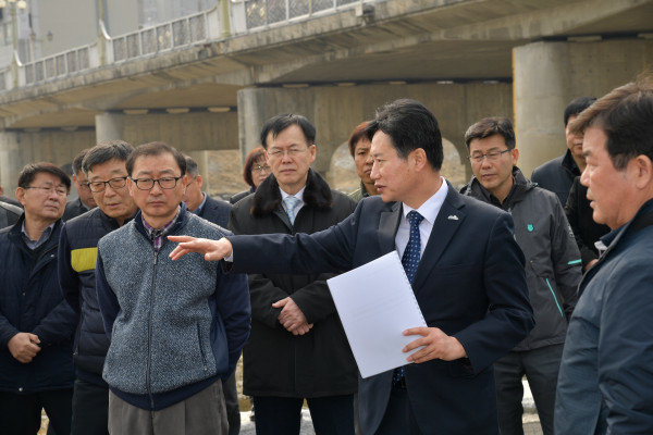 경기 포천시는 지난 12일 시청 간부공무원 70여명이 참석한 가운데 하천경관 개선사업과 생태하천 복원사업이 진행되고 있는 포천천 일원을 방문해 ‘3월 중 찾아가는 현장 간부회의’를 개최했다. 사진은 회의에 참석한 시청 관계자들이 의견을 공유하는 모습. (사진제공=포천시청)