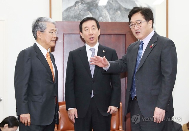 14일 오전 국회에서 열린 여야 3당 원내대표 회동에서 참석자들이 얘기를 나누고 있다. 왼쪽부터 바른미래당 김동철 원내대표, 자유한국당 김성태 원내대표, 더불어민주당 우원식 원내대표.