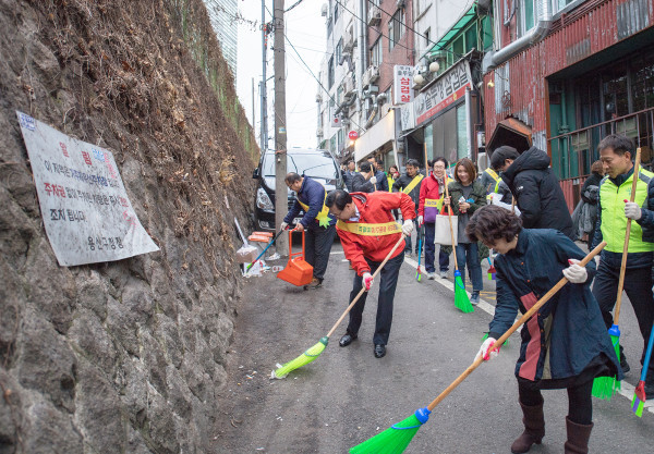 14일 서울 용산구 내 16개동 전역에서 새봄맞이 대청소 '클린데이' 행사의 일환으로 청소가 진행됐다. 사진은 이날 행사에 참여한 주민, 공무원, 환경미화원들이 거리를 청소하는 모습. (사진제공=용산구청)
