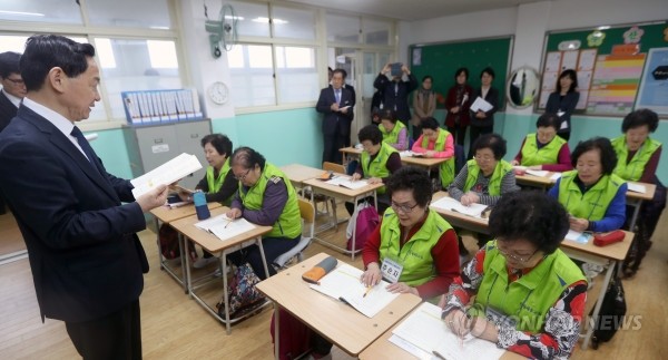 김상곤 사회부총리 겸 교육부 장관이 15일 오전 경남 창원시 마산합포구 완월초등학교 성인문해교실을 찾아 교재를 낭독하고 있다.