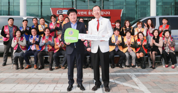 국제라이온스협회재단(LCIF)과 국제라이온스협회 354-B지구 제3지역이 경기 용인시청에 자원봉사활동 지원용 차량으로 스타렉스 차량 2대를 기탁했다. 사진은 기탁식에 참석한 라이온스협회 회원 및 시 관계자들이 기념촬영을 하는 모습. (사진제공=용인시청)